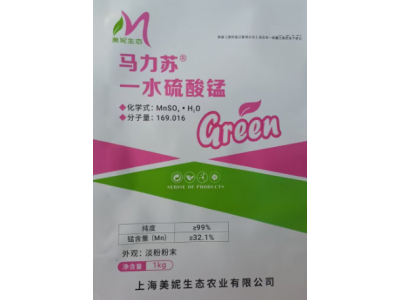 一水硫酸锰是重要的微量元素肥料之一,极易溶于水、纯度高,用作无土栽培、叶喷及土壤滴灌或浇灌等。锰是维持叶绿体结构所必须的微量元素,促进作物生长发育,提产优质,防治作物缺锰症。
