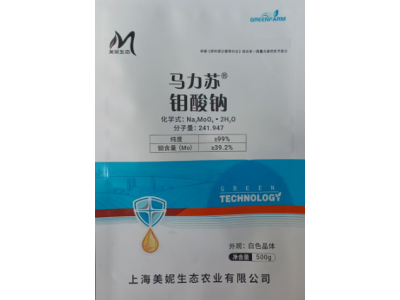 二水钼酸钠是一种常见的钼肥,纯度高、易溶于水,主要应用在无土栽培营养液中,为作物提供钼元素,用量极少,预防蓝莓因缺钼引起的老叶黄化、叶脉间失绿等症状。