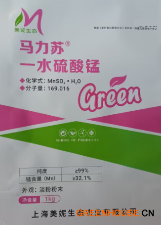 一水硫酸锰是重要的微量元素肥料之一,极易溶于水、纯度高,用作无土栽培、叶喷及土壤滴灌或浇灌等。锰是维持叶绿体结构所必须的微量元素,促进作物生长发育,提产优质,防治作物缺锰症。