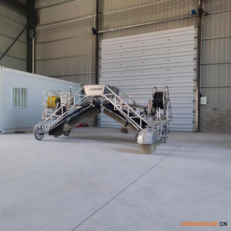 的一侧,屋顶清洗机和供水装置放置在移动平台上,遮光喷涂装置与屋顶清洗机连接。这种装置具有较高的自动化程度和清洗效率,适合清洗连栋玻璃温室屋顶。