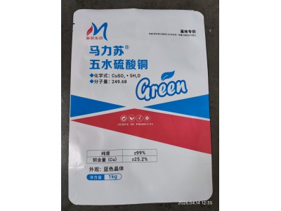 五水硫酸铜也是一种微量元素肥料,能提高叶绿素的稳定性,预防叶绿素不致于过早地被破坏,促进作物吸收,预防作物因缺铜引起的新叶失绿发黄、叶尖发白卷曲等症状。